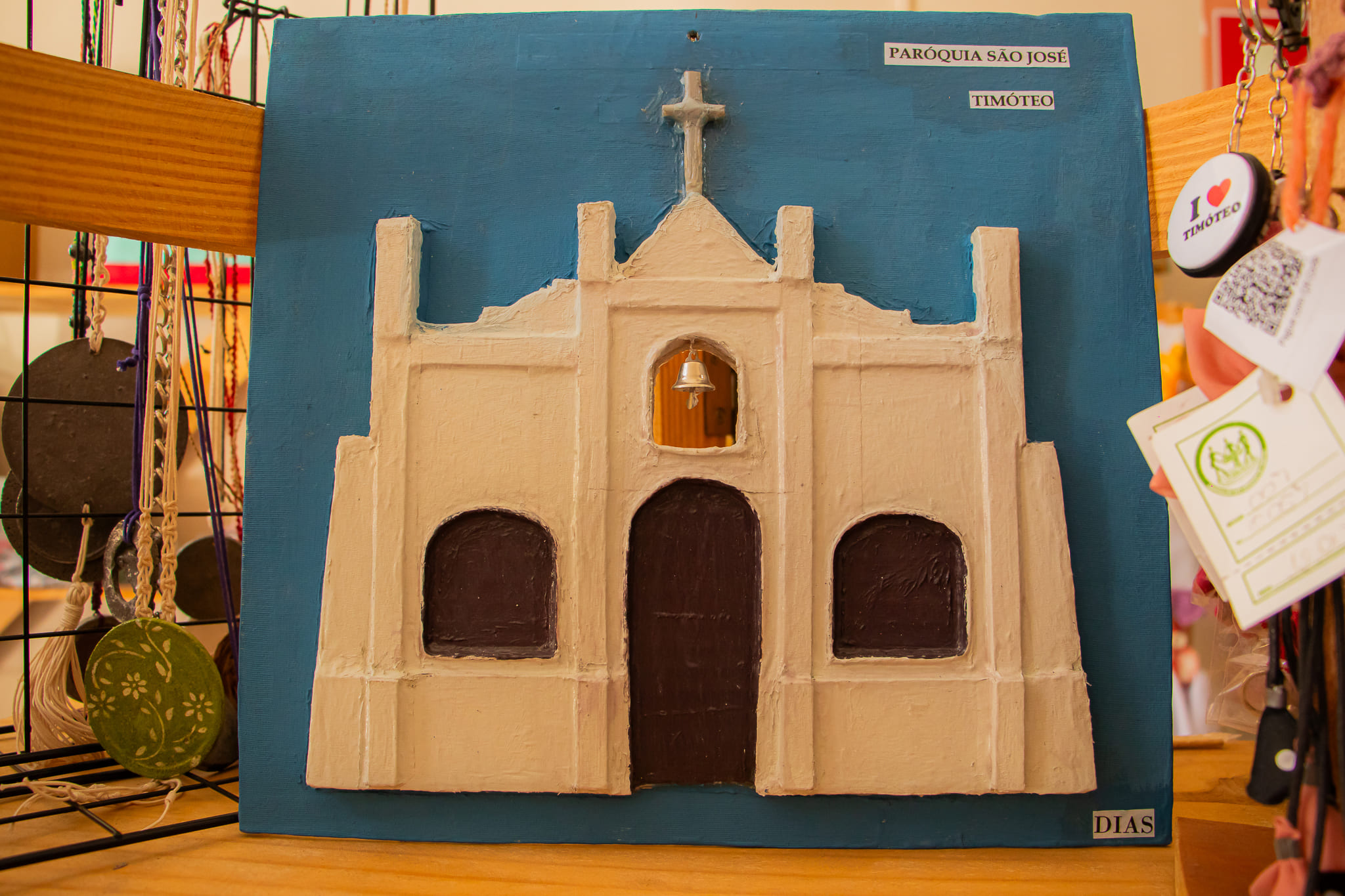 Produtos Personalizados: Bordados e estamparia com temas locais, como o coreto e a Igreja Matriz de Timóteo.