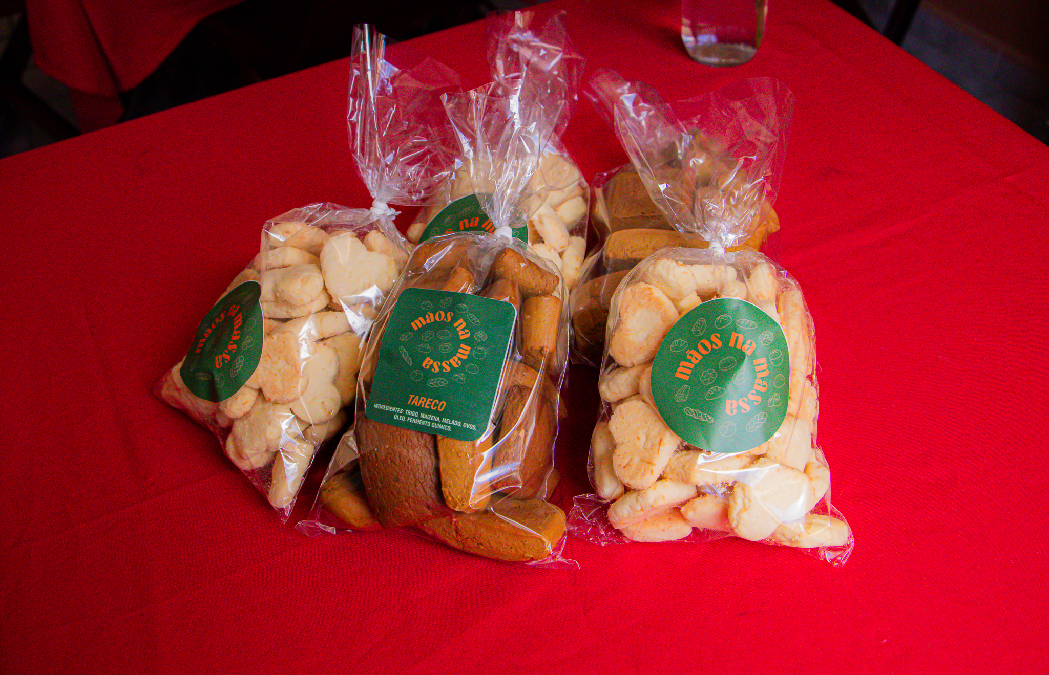 Produtos, como a sacolinha de quitandas (300g), a partir de R$ 15,00. Buffet: valores personalizados, agendamento com antecedência mínima de um mês.